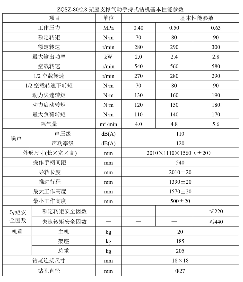 架座支撑手持式气动钻机为便携式,它具有安全、防爆、转矩大、带有反转、转速高、质量小、体积小、效率高、结构可适用于各种用途钻孔,如瓦斯抽放孔、探水孔、锚固支护孔,广泛应用于煤炭、铁道、建筑、地矿等工程施工作业。该机采用压缩空气为源动力,安全性好,适用性强。